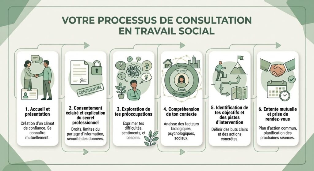 La consultation individuelle en travail social est un espace confidentiel et bienveillant où tu peux explorer tes défis personnels, relationnels ou familiaux avec un professionnel qualifié.